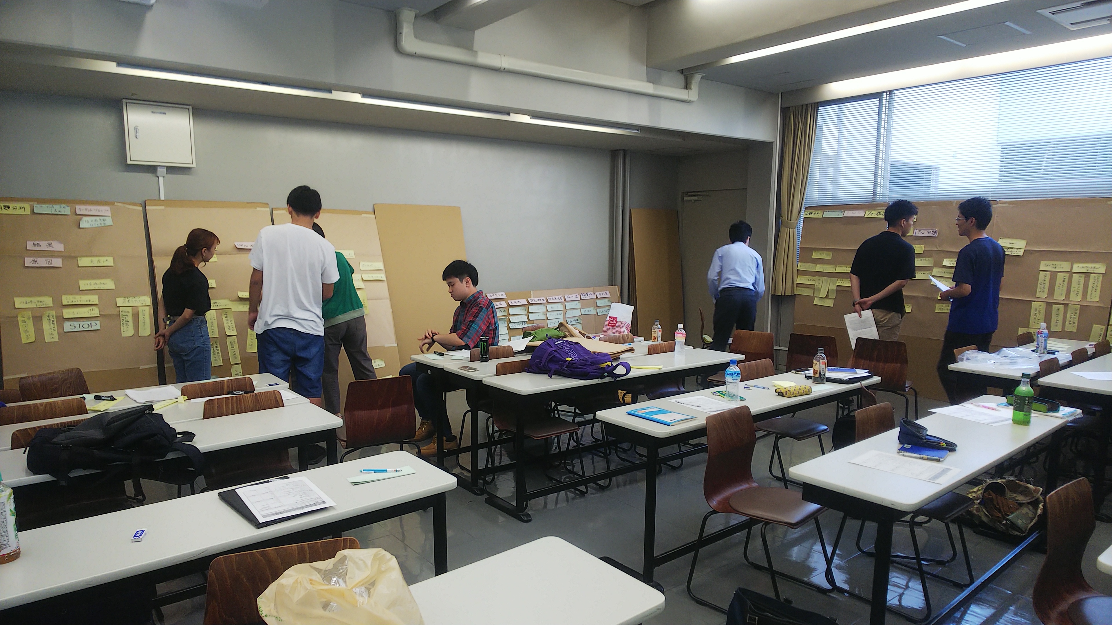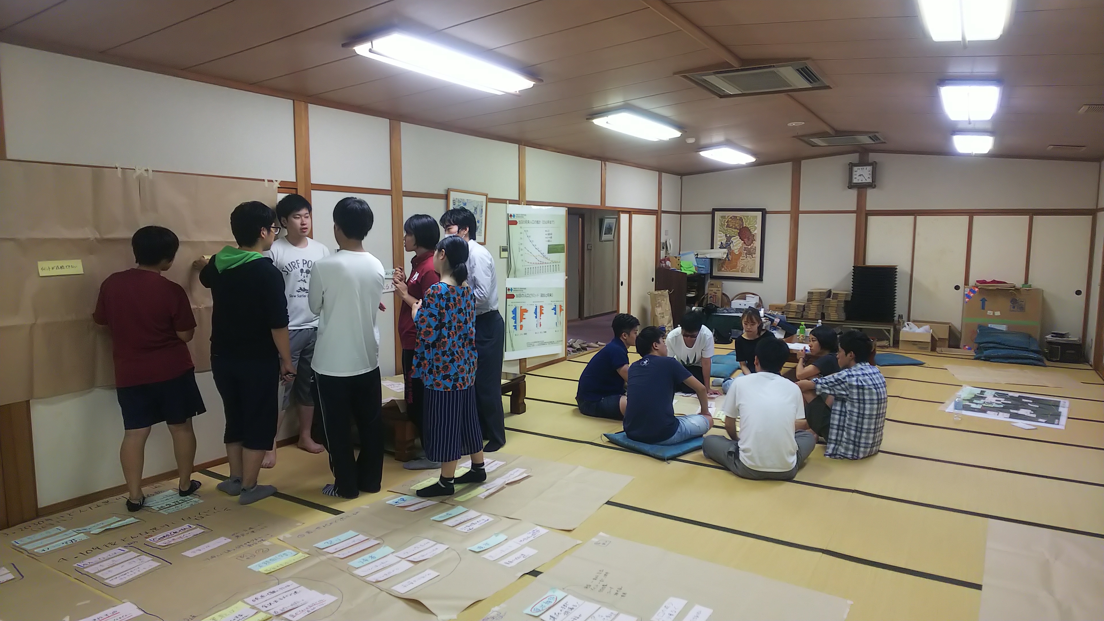 研究室の全メンバー(合計15名)で実施した能登合宿での分析作業(写真は地域における自然環境保全の課題分析) (⇒2018年度から2年目)
